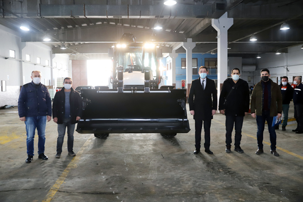Belediye Başkanı Av. Tolga Tosun Türkiye Belediyeler Birliği tarafından Bandırma Belediyesine hibe edilen çok amaçlı kepçeyi Belediye şantiyesinde inceledi.