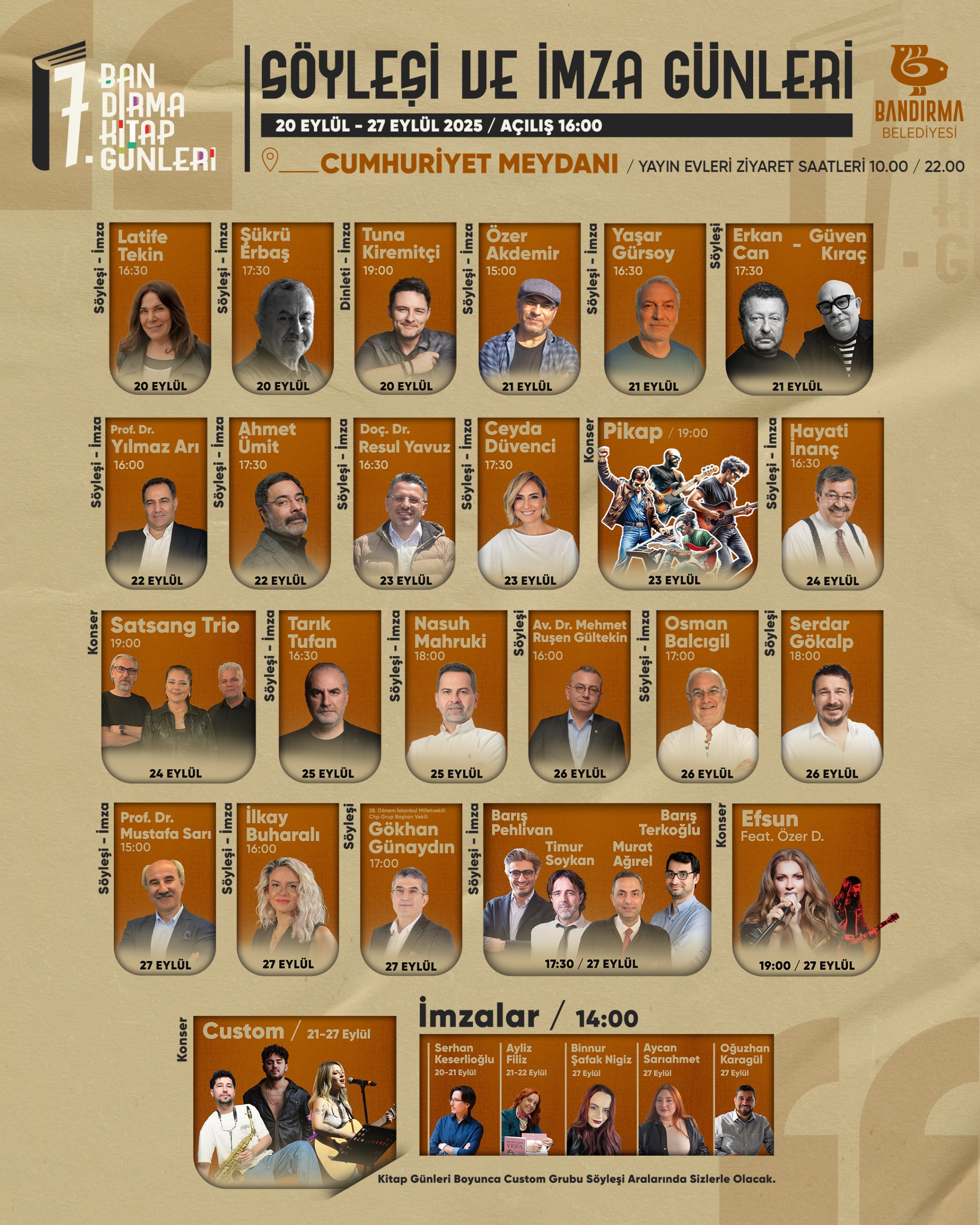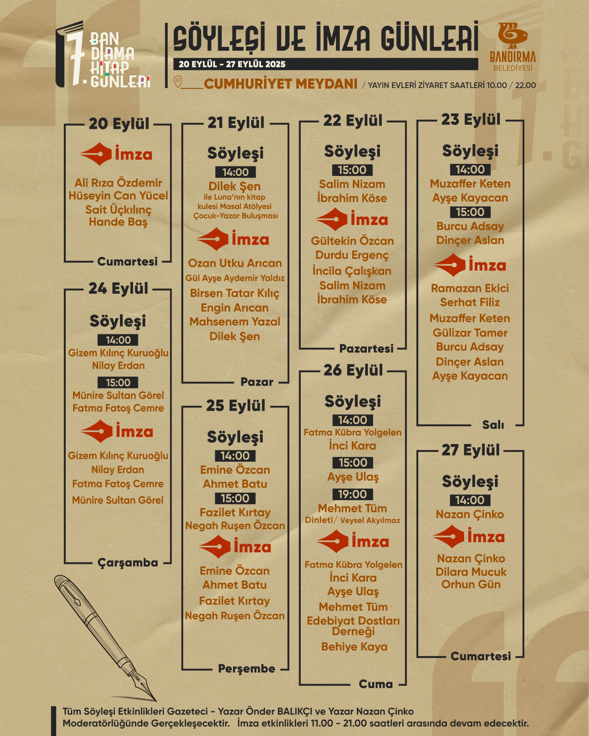 20-27 Eylül tarihleri arasında Cumhuriyet Meydanı'nda gerçekleşecek olan Kitap Günlerinde binlerce kitap, seçkin yazarlar, konuklar, onlarca yayınevi, söyleşiler, dinletiler ve imza programlarıyla dopdolu bir program yine sizleri bekliyor.