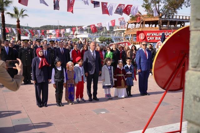 Ayvalık’ta saat 09.30’da ilçe merkezindeki Cumhuriyet Meydanı’nda Ayvalık Kaymakamı Hasan Yaman, Garnizon Komutanı Albay, Garnizon Komutanı Albay Hüseyin Aydın, Ayvalık Belediye Başkanı Mesut Ergin’in yanı sıra daire amirleri, gaziler, şehit yakınları, siyasi parti temsilcileri, öğrenciler ve çok sayıda vatandaş katıldı. İlçe Milli Eğitim Müdürü Güner Bahadır, daire amirleri, gaziler, şehit aileleri, öğretmenler, öğrenciler ve vatandaşların hazır bulunduğu çelenk sunma töreninin ardından etkinlikler, saat 10.30’da Hüsnü Uğural Stadyumu’nda sürdü.