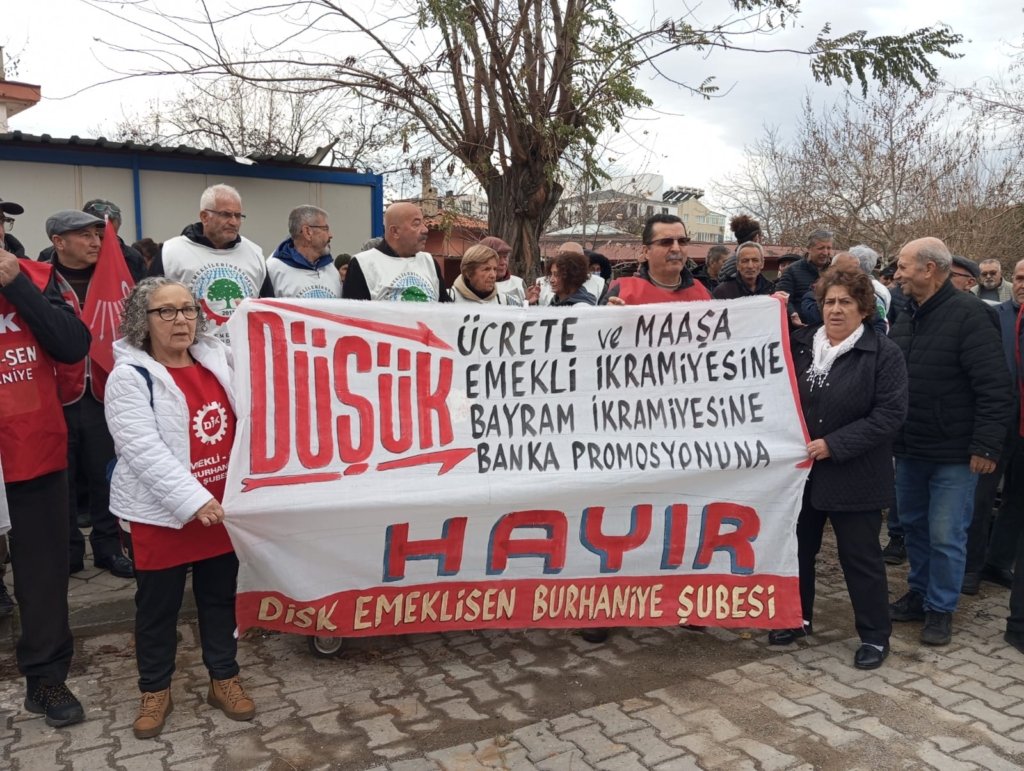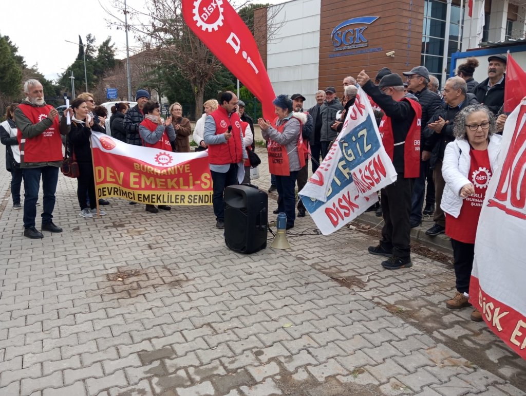 DİSK Devrimci Emekliler Sendikası Burhaniye BAĞ-KUR önünde yaptığı kitlesel basın açıklaması ile TÜİK’in asılsız verilerine dayanarak çalışanların ücretlerini açlık sınırının altında belirlemesine karşı tepki gösterdi. Uüm Emeklilerin Sendikssı Burhaniye Şubesi ve Burhaniye Halk İnsiyatifi’nin de destek verdiği basın açıklaması sırasında kitlenin sık sık hükümet ve TÜİK aleyhinde slogan attığı açıklamayı Disk Devrimci Emekliler Sendikası Burhaniye Şube Başkanı Sendikası Selma Canlı Püskül ve Disk Genel-İş Balıkesir Şubesi Mali Sekreteri Uğur Mamuk dönüşümlü olarak okudular.Yapılan basın açıklamasında şu ifadelere yer verildi.