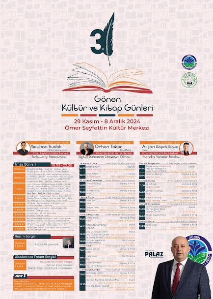 Başkanlığını Samet Ariker'in yürüttüğü Gönen Kent Konseyi-Gönen Belediyesi işbirliğiyle, Gönen Ömer Seyfettin Kültür Merkezi'nde, 29 Kasım-8 Aralık 2024 tarihleri arasında düzenlenecek etkinliklere çok sayıda şair ve yazar, söyleşi-imza gününe katılacak.
