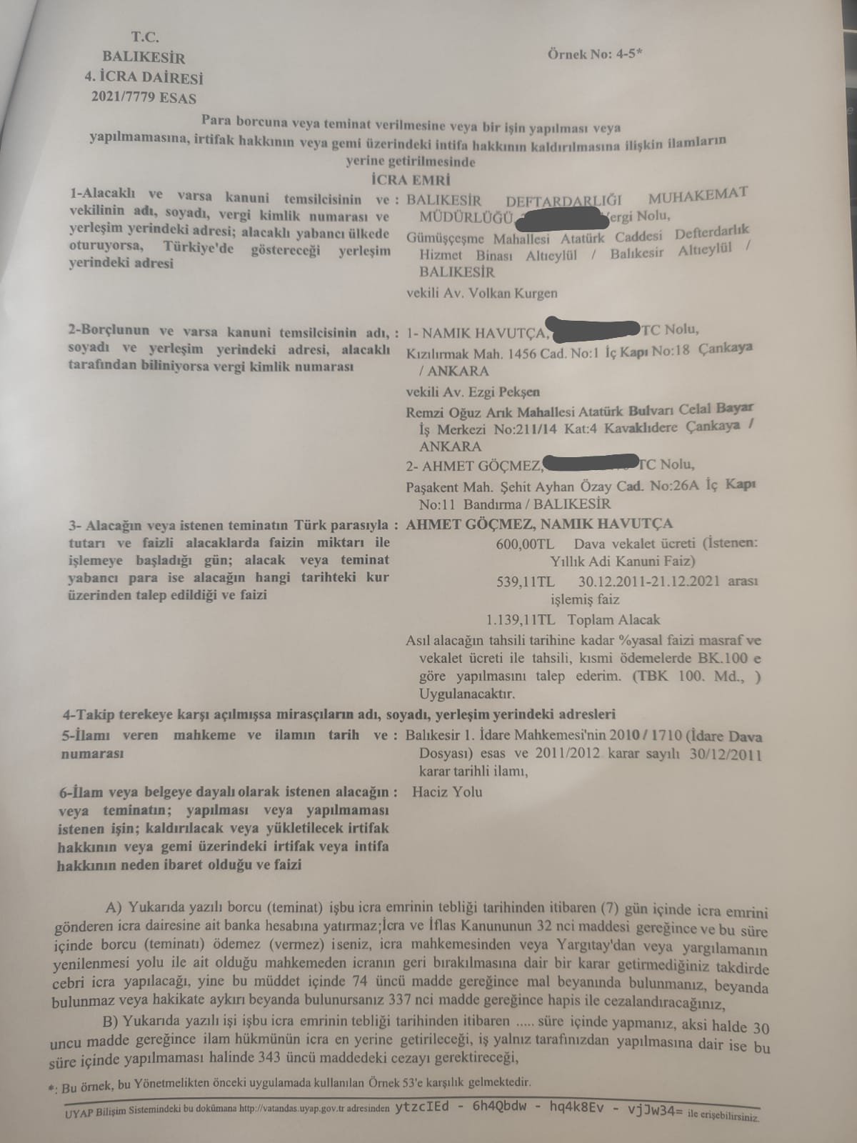 Yıllar sonra, konusuz kalan satışı iptali kararı ve İGM de yok olduğu halde, Balıkesir Hazine Defterdarlığı Muhakemat Müdürlüğü avukatı tarafından Ahmet Göçmez ve bana icra emri gönderildi. Yani biz vatanın, milletin malının satışını engelleyerek vatanın malını koruduğumuz, kolladığımız için borçlu çıktık ve icra masrafları ve avukatlık ücretini 2010 yılından itibaren işleyen faizi ile birlikte toplamda 1.741 TL’yi ödemek zorunda kaldık. Yani vatanın ve milletin malını korumanın bedeli buydu! Bir tarafta hazineyi, devletin bankalarını hortumlayıp milyarlarca dolar devleti zarara uğratanlar, vergisini kaçıranlar, ödemeyenler diğer tarafta daha devam eden yargı sürecinin (Karar düzeltme istenmiş idi) avukatlık ücretini faizi ile birlikte ödenmesi için icra emri gönderip haciz tehdidine maruz kalmak..