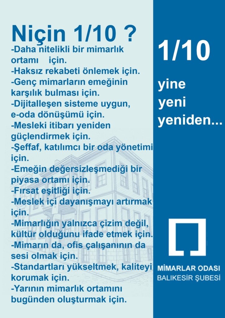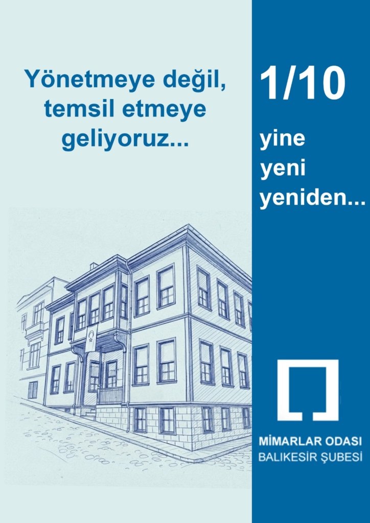 Mimarlar Odası Balıkesir Şubesi’nin 22 Şubat tarihinde gerçekleştirilecek olan genel kurulunda ”Yine, Yeni, Yeniden 1/10” temasının yer aldığı mavi liste gündem yarattı.